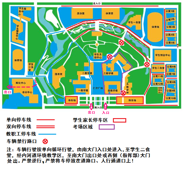 1.因学校单招考试期间进出车辆较多,车流量大,请各自驾车主配合学校保卫部门工作人员,按指定场所有序停放车辆。3月30日9点后,院内部分道路将实施交通管制,考生家长不得进入考试区域(见下图)。