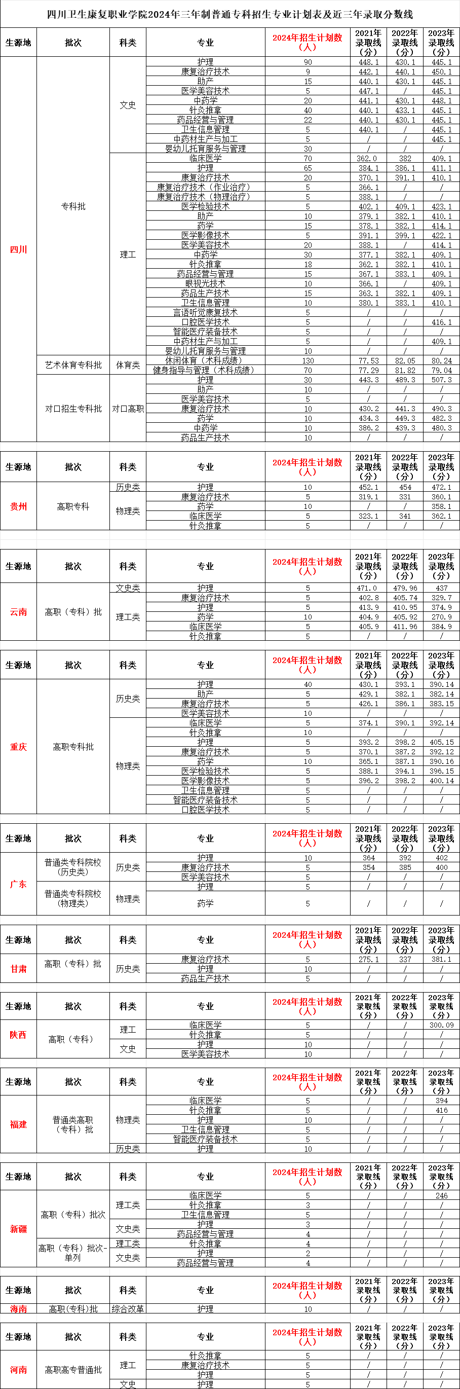 学院面向全国11个省、市(直辖市)、自治区招生。开设临床医学、护理、康复治疗技术、医学影像技术、医学检验技术、针灸推拿、助产、药学、中药学、药品经营与管理、医学美容技术、眼视光技术、休闲体育、康复辅助器具技术、老年保健与管理、药品生产技术、言语听觉康复技术、卫生信息管理、健身指导与管理、现代家政服务与管理、智能医疗装备技术、口腔医学技术、中药材生产与加工、婴幼儿托育服务与管理24个专业和康复治疗技术(物理方向)、康复治疗技术(物理方向)2个专业方向。其中临床医学、针灸推拿为国控专业。 机会多多,欢迎大家报考我院!
