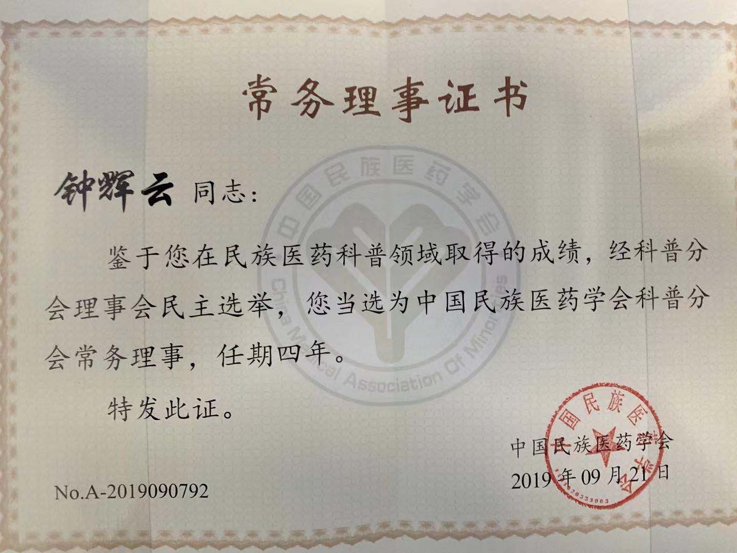 近日,在中国民族医药学会举办的第三届健康科普论坛和中国民族医药学会科普分会2019年度年会上,中医药文化科普实践基地负责人钟辉云当选为常务理事,任期四年。